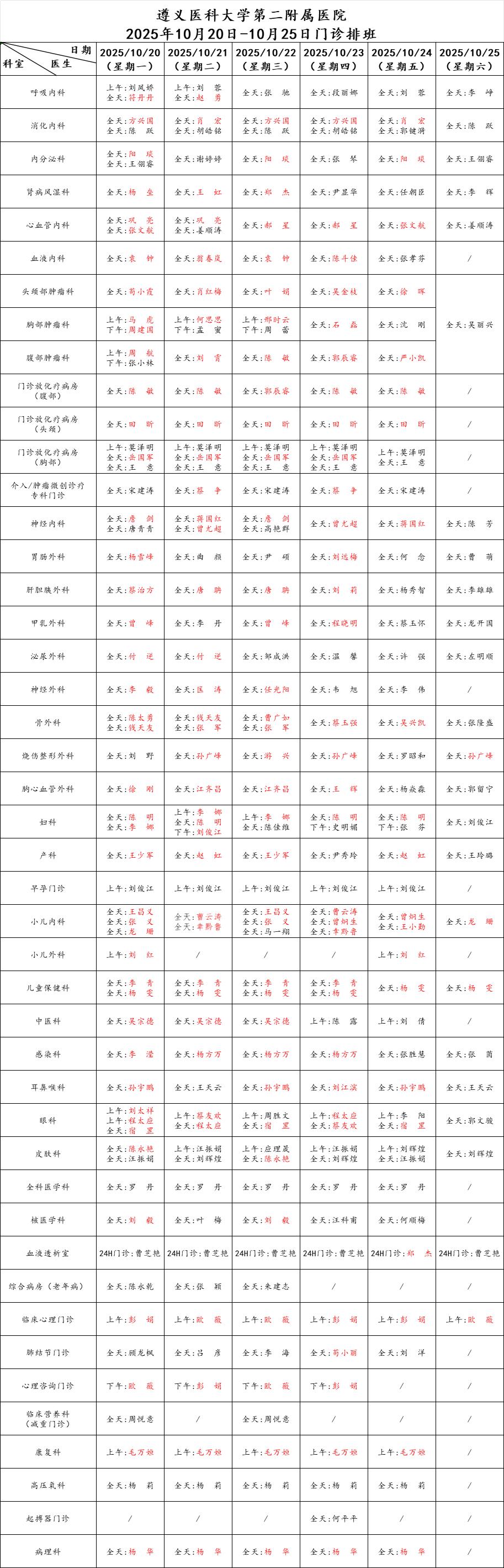 遵义医科大学第二附属医院2025年10月20日-10月25日门诊排班公示